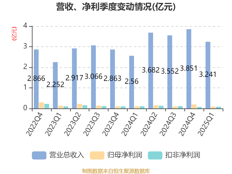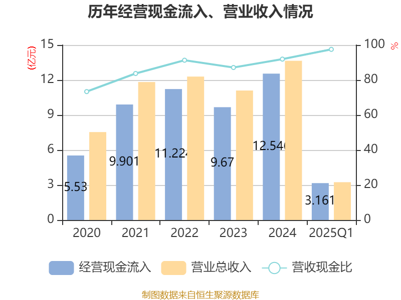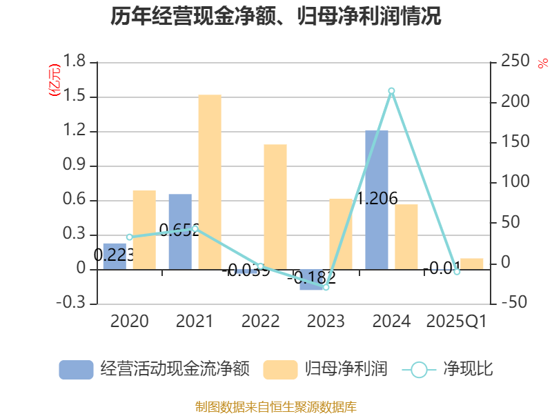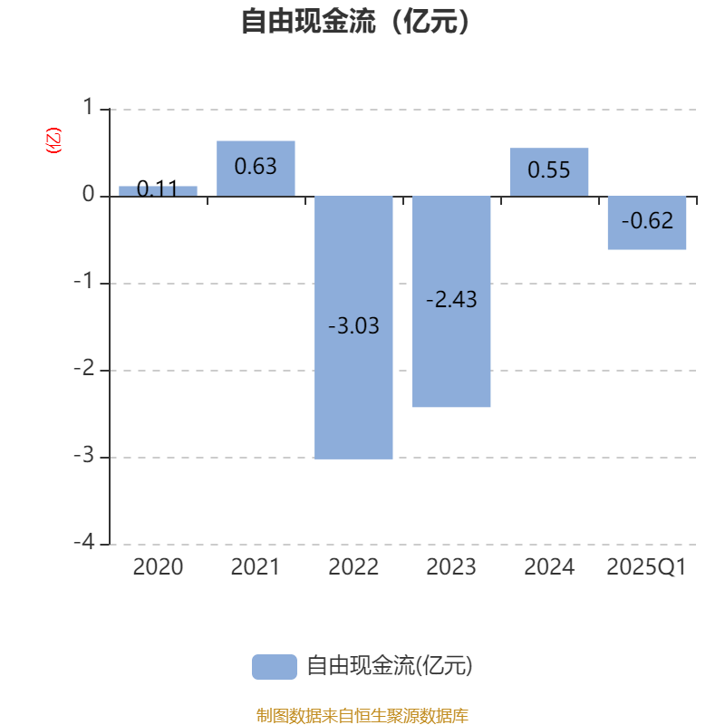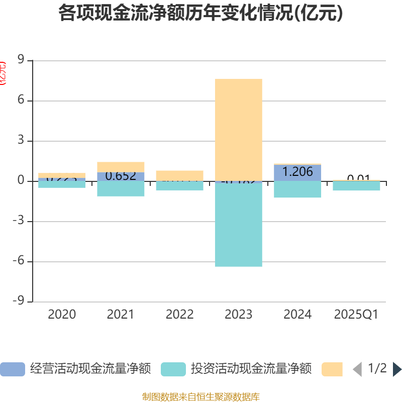 截至2025年一季度末,公司经营活动现金流净额为-97.54万元,同比增加2044.83万元;筹资活动现金流净额757.15万元,同比增加1979.87万元;投资活动现金流净额-7051.71万元,上年同期为-2464.23万元。