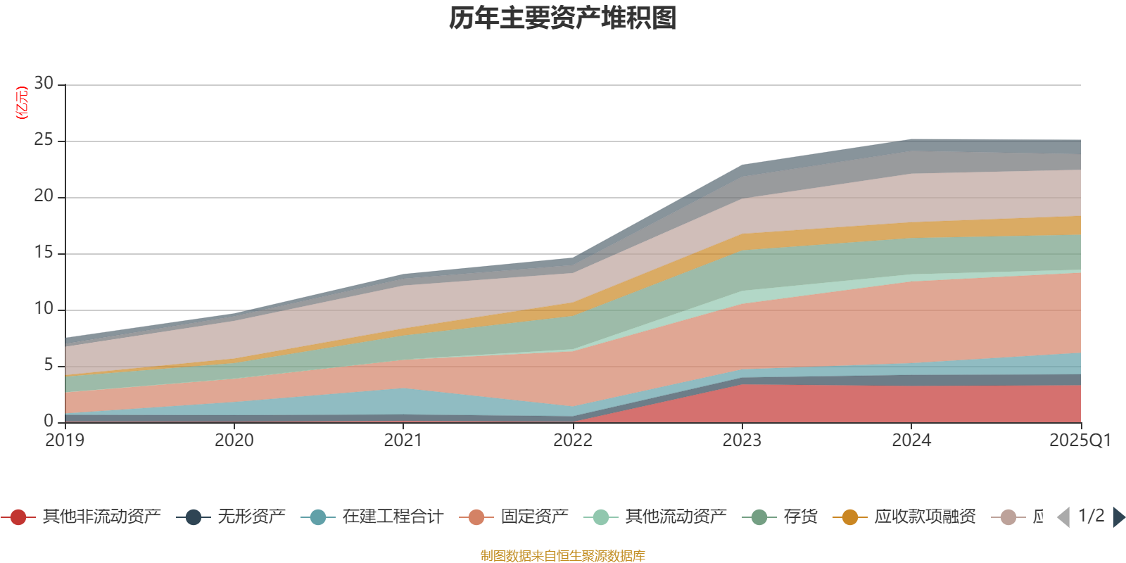 资产重大变化方面,截至2025年一季度末,公司在建工程合计较上年末增加83.18%,占公司总资产比重上升3.5个百分点;货币资金较上年末减少30.48%,占公司总资产比重下降2.43个百分点;其他流动资产较上年末减少58.08%,占公司总资产比重下降1.48个百分点;应收款项融资较上年末增加18.61%,占公司总资产比重上升1.06个百分点。