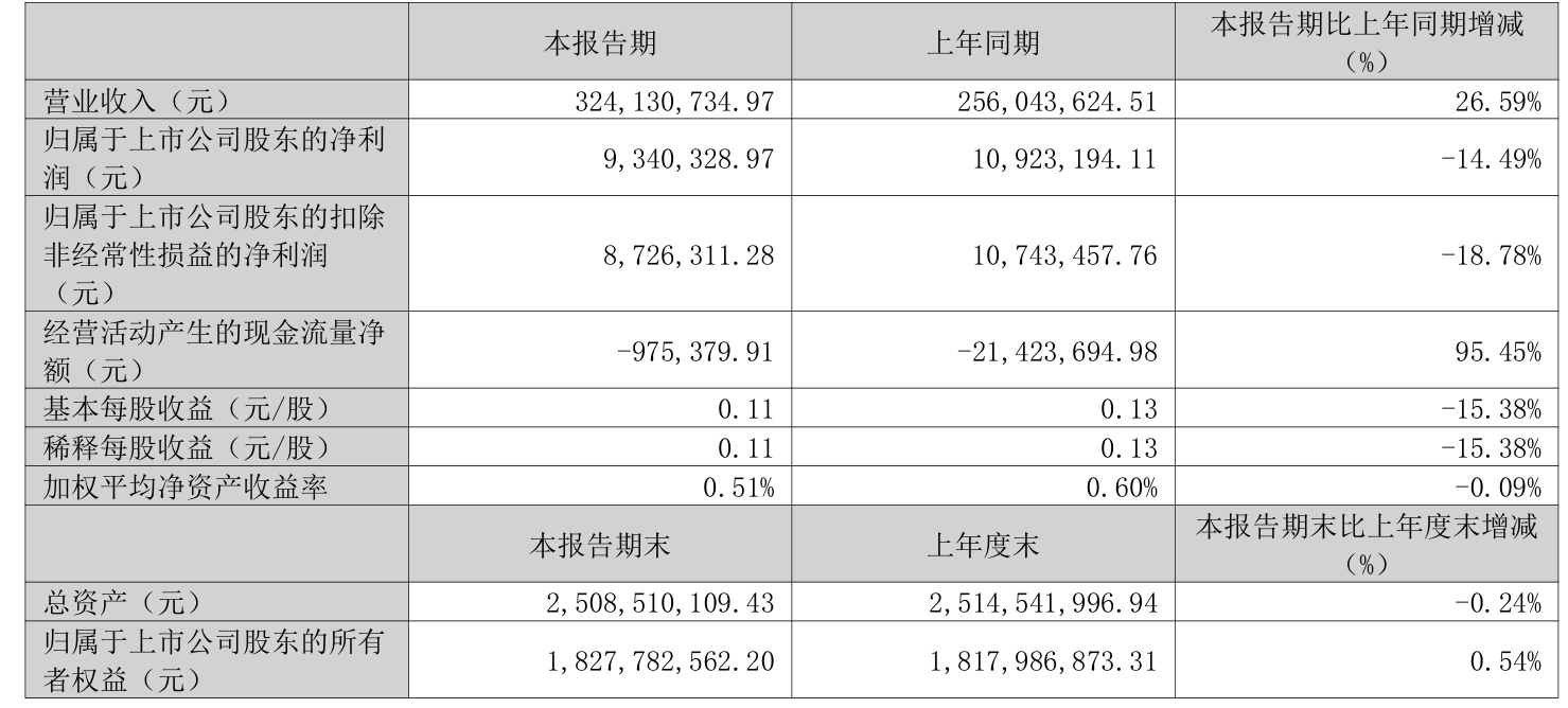 中证智能财讯金杨股份(301210)4月25日披露2025年第一季度报告。公司实现营业总收入3.24亿元,同比增长26.59%;归母净利润934.03万元,同比下降14.49%;扣非净利润872.63万元,同比下降18.78%;经营活动产生的现金流量净额为-97.54万元,上年同期为-2142.37万元;报告期内,金杨股份基本每股收益为0.11元,加权平均净资产收益率为0.51%。